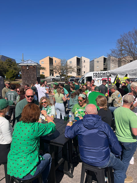 Group of people in green shirts at a St. Patrick's Day event, drinking beer.